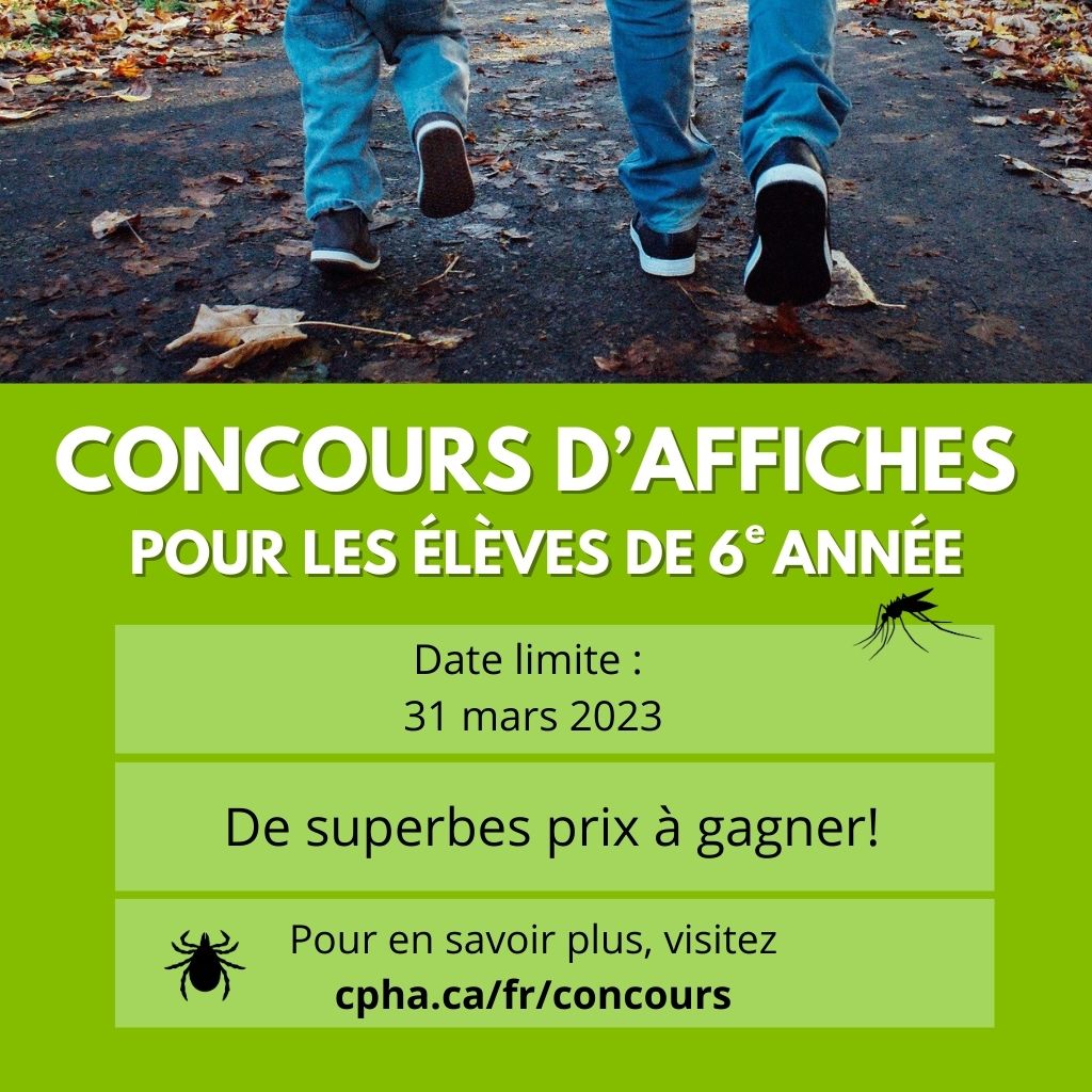 Le concours national d’affiches de l’Association canadienne de santé publique est l’occasion pour les élèves de 6e année du Canada d’approfondir leurs connaissances des maladies infectieuses sensibles au climat, comme la maladie de Lyme et le virus du Nil occidental, puis de partager leurs connaissances sur ces maladies et les moyens de les prévenir avec leurs amis, leur famille et leur communauté.